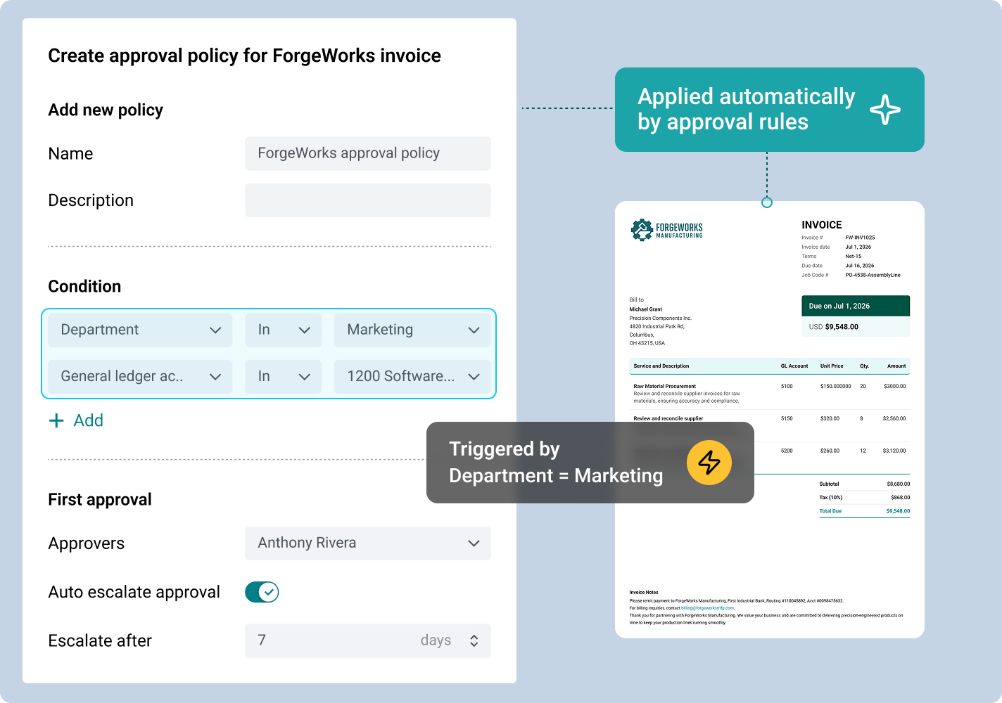 Trigger multiple approval policies simultaneously for invoices that cross departments or teams, ensuring everyone reviews in parallel without delays.