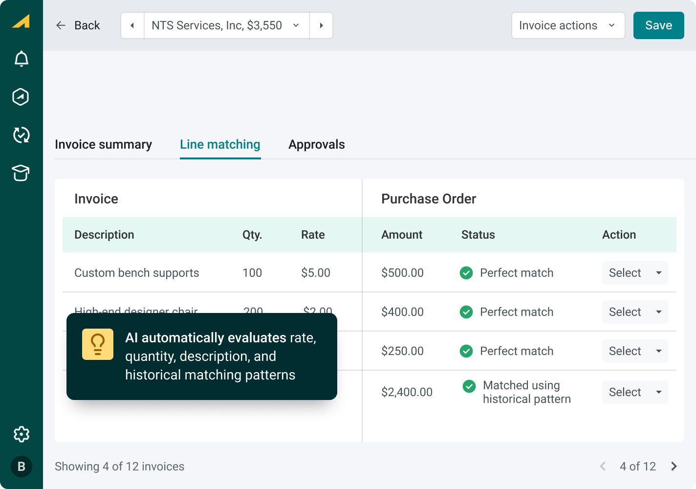 Advanced AI algorithms automatically match invoice lines with purchase order lines by analyzing rate, quantity, description, and item codes. The system learns from every match, continuously improving accuracy and speed.