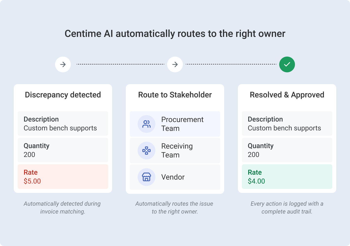 Route mismatches directly to procurement, receiving, or finance stakeholders with built-in collaboration workflows. Resolve issues without email chains or disconnected systems.